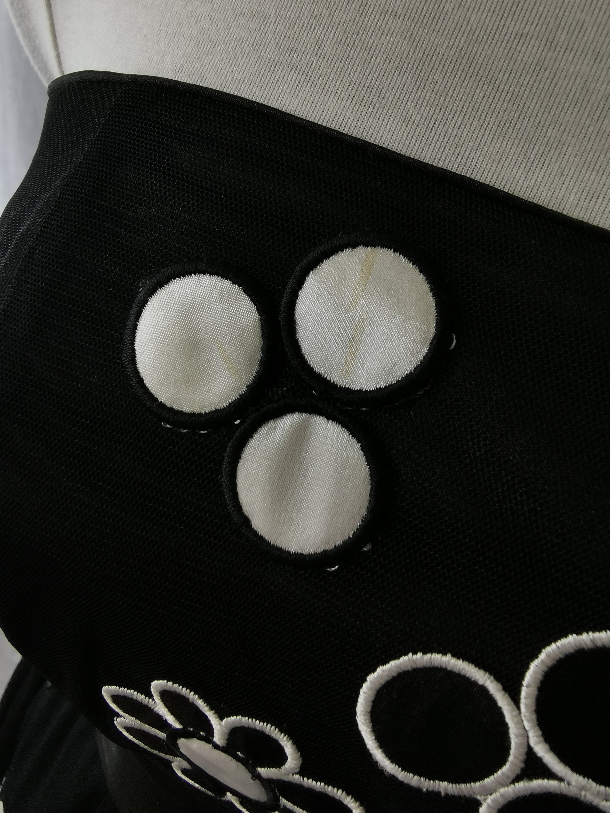 This refined Black and White Dress features a contemporary mid-thigh length silhouette enhanced with architectural circle embellishments. The sophisticated net skirt construction provides structural dimension while maintaining fluid movement. Expertly tailored to balance visual interest with technical precision for a distinctive formal aesthetic.